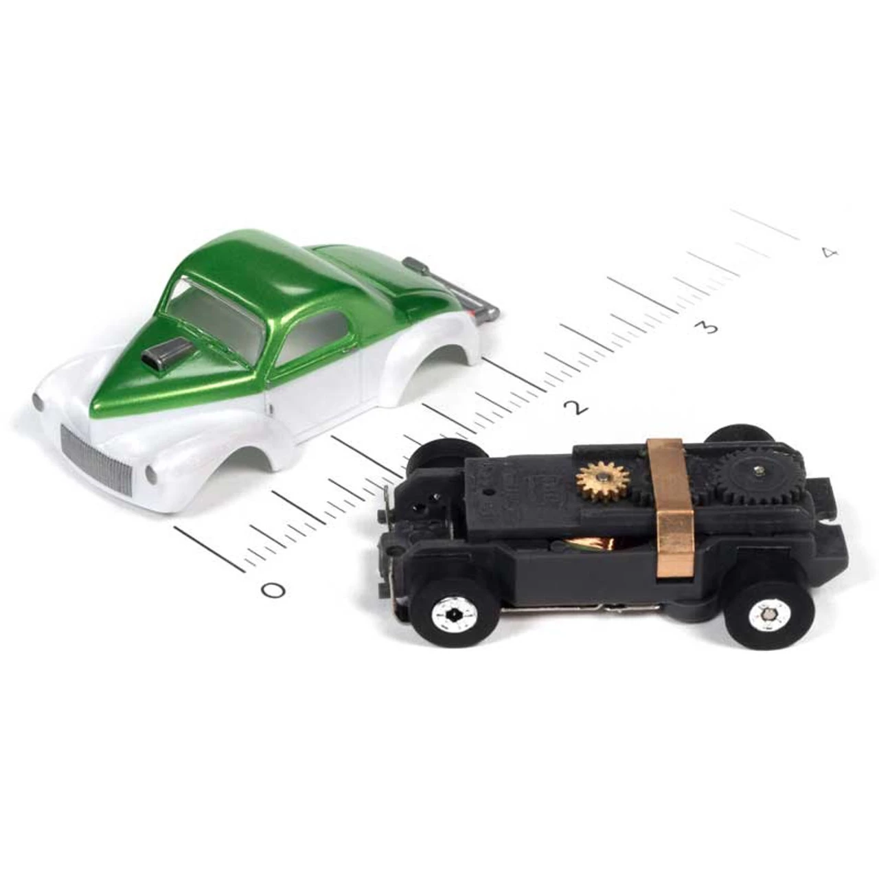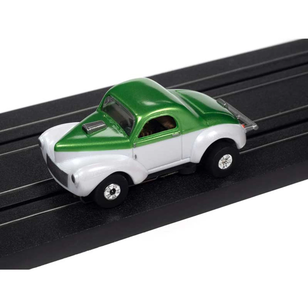 This is the Auto World 1941 Willys Coupe Gasser Green/White Thunderjet HO Slot Car from the Cars-N-Coffee Thunderjet Release 31 series.