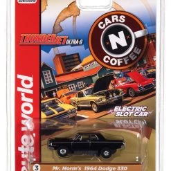 This is the Auto World 1964 Dodge 330 “Mr. Norm’s” (Black) Cars N Coffee Thunderjet HO Slot Car.