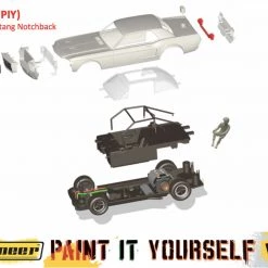 This is the Pioneer 1968 Mustang Notchback Race Car Paint It Yourself PIY Kit 1/32 Slot Car. These kits give modelers of all ages the opportunity to both customize their vehicle and learn about the mechanical workings of the cars.