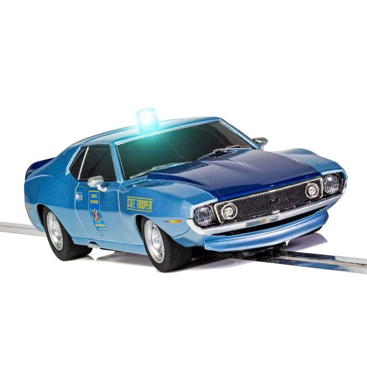 This is the Scalextric AMC Javelin Alabama State Trooper 1/32 Analog Slot Car. These are a piece of American muscle car and law enforcement history. This Alabama Police Javelin is sure to catch the crooks. The car features a working siren light, headlights, and is Digital Plug Ready.