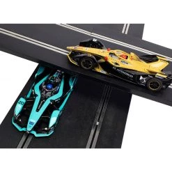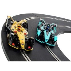 This is the Scalextric Formula E World Championship Spark Plug 1/32 Slot Car Track Set. This set features the Scalextric Spark Plug technology, which allows you to race using smart devices rather than traditional hand controllers!