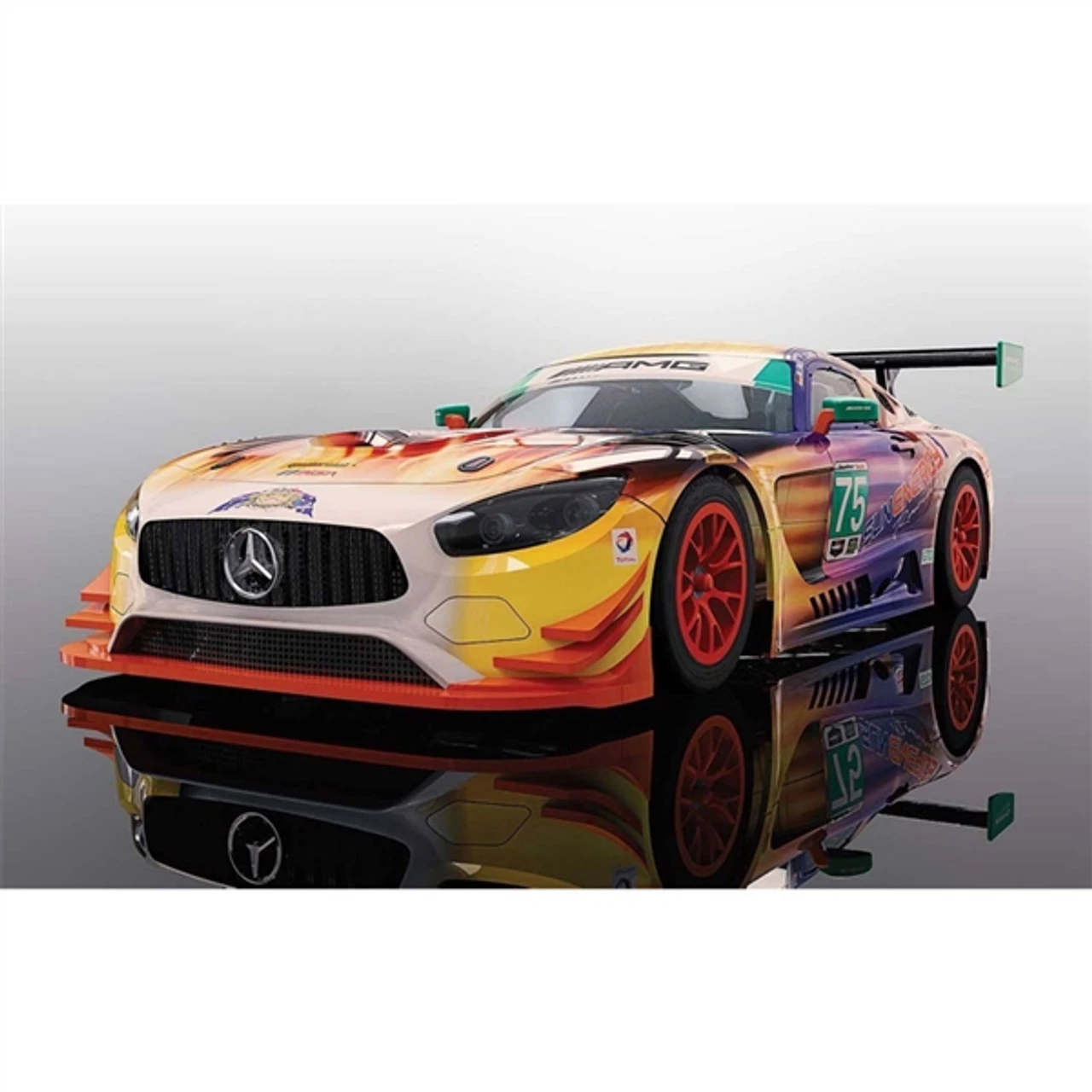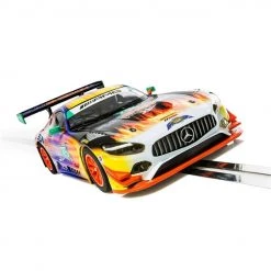This is the Scalextric Mercedes AMG GT3 SubEnergy Racing 2017 24h Daytona 1/32 Analog Slot Car. Racing in the IMSA WeatherTech Sports Car Championship, this Mercedes AMG GT3 features one of the most striking liveries ever put onto a Scalextric model. Mimicking the heat of the sun in reference to its sponsor SunEnergy, the car seems to be a mass of heat and flame flying around the circuit. The car itself raced at the 2017 Daytona 24 Hours and has continued to be a fixture in the IMSA series throughout the year. Raced by a number of drivers including factory Mercedes man Maro Engel, the car itself sadly did not finish, but its livery certainly left a lasting impact on spectators.